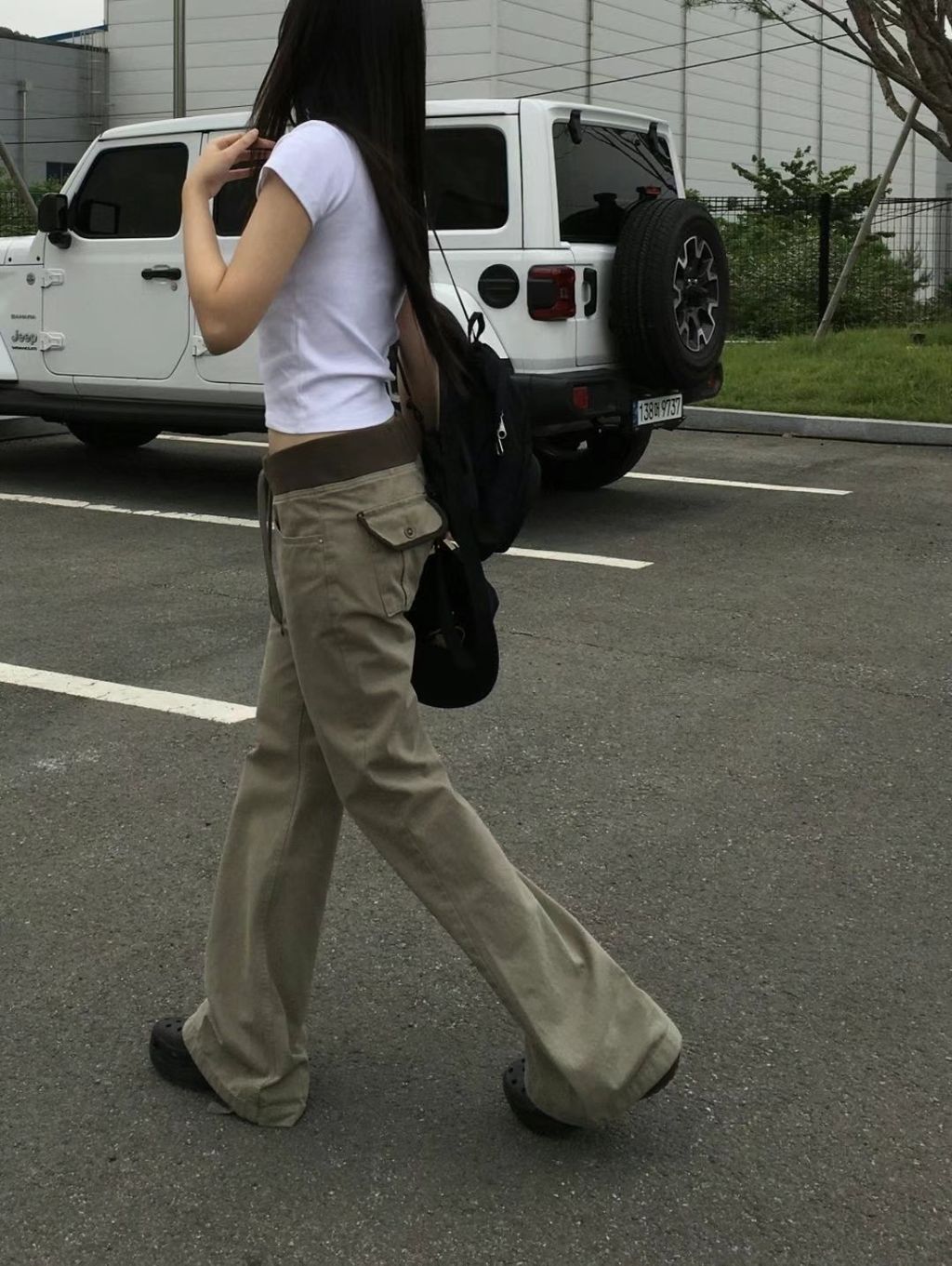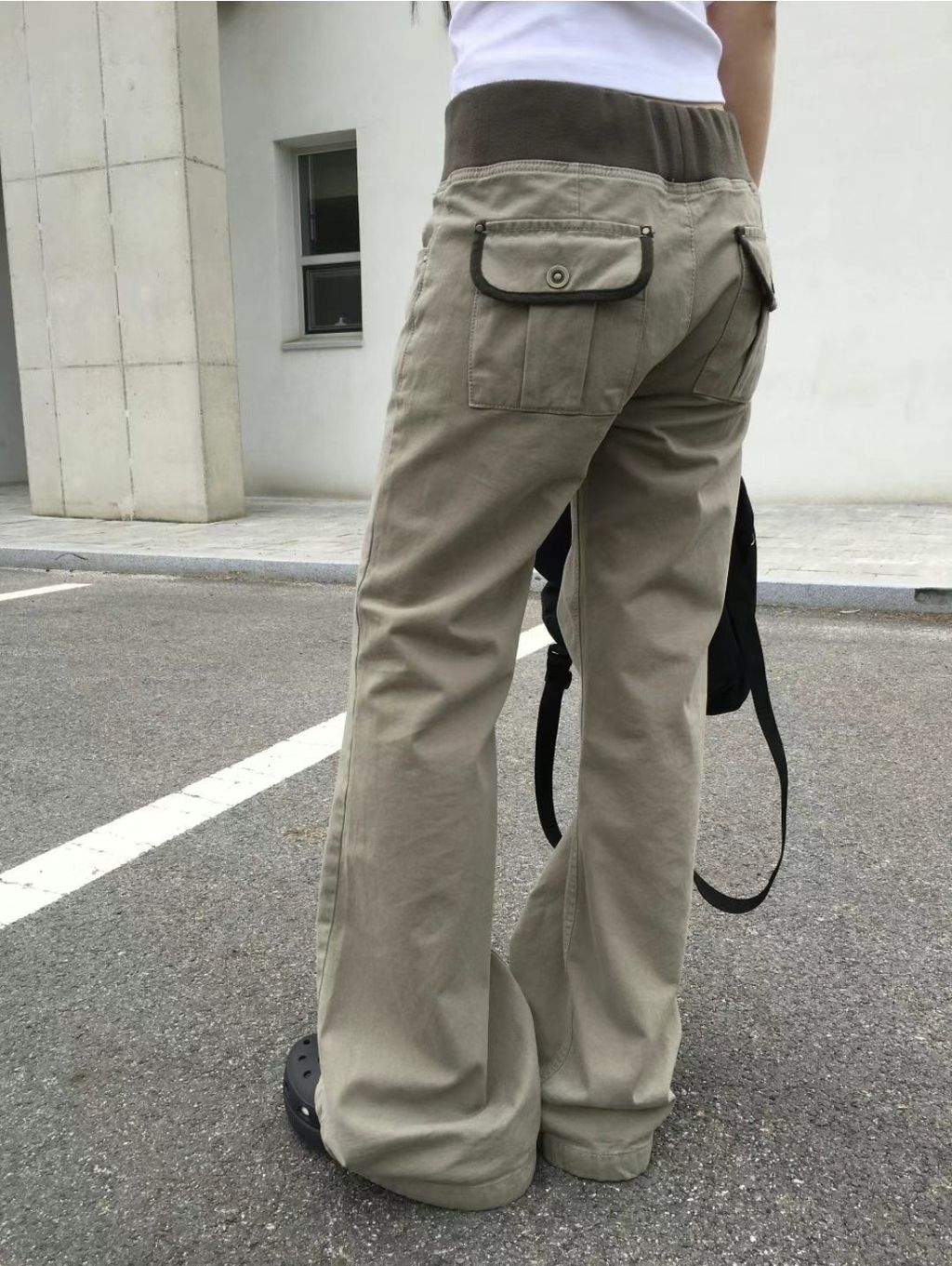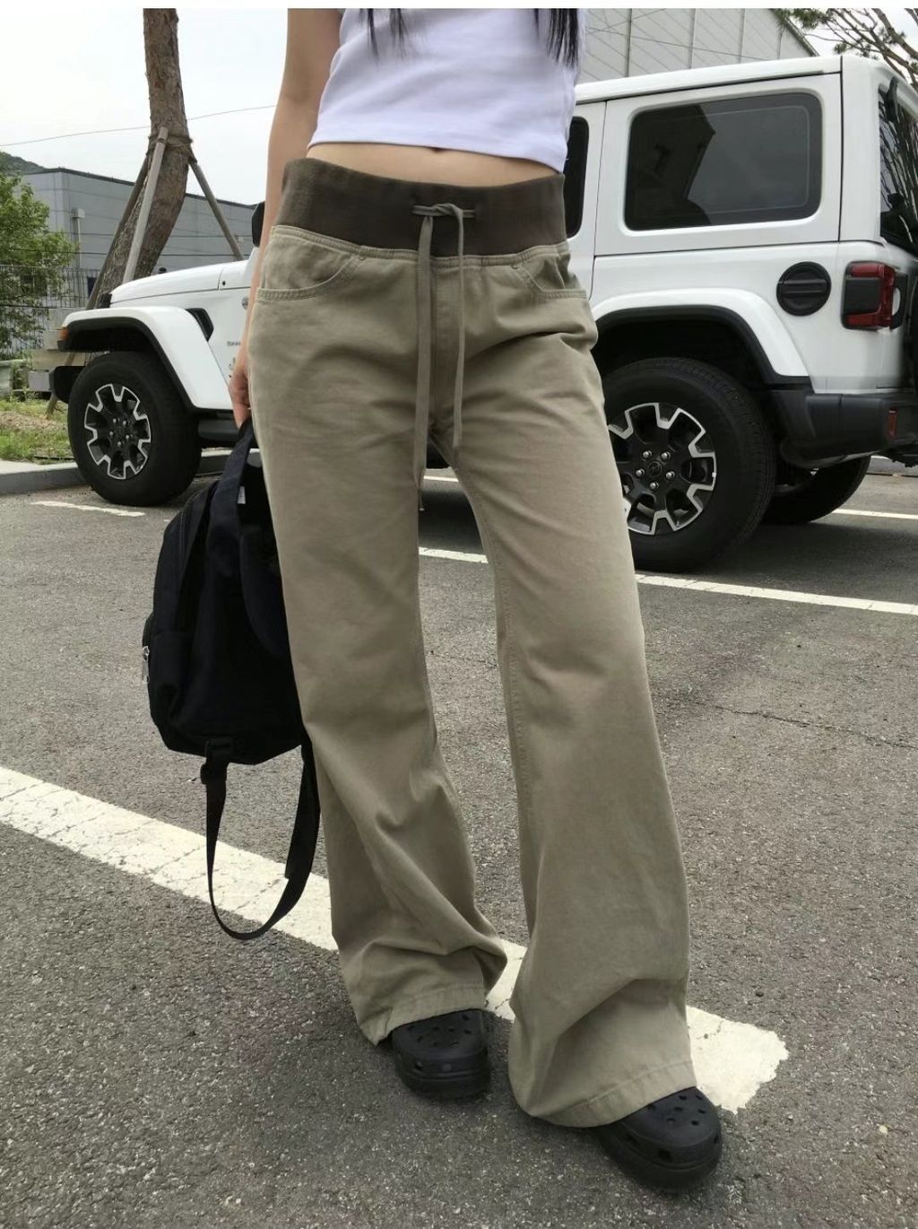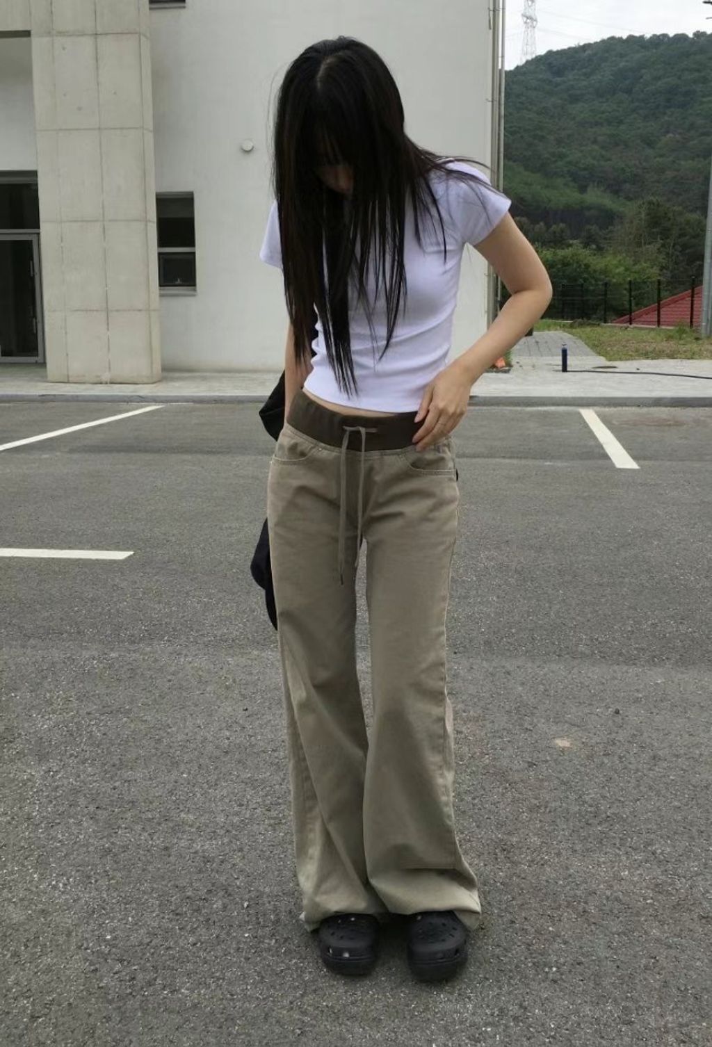 「韓國連線」N23 拼接撞色軍綠休閒長褲(褲管有抽繩)