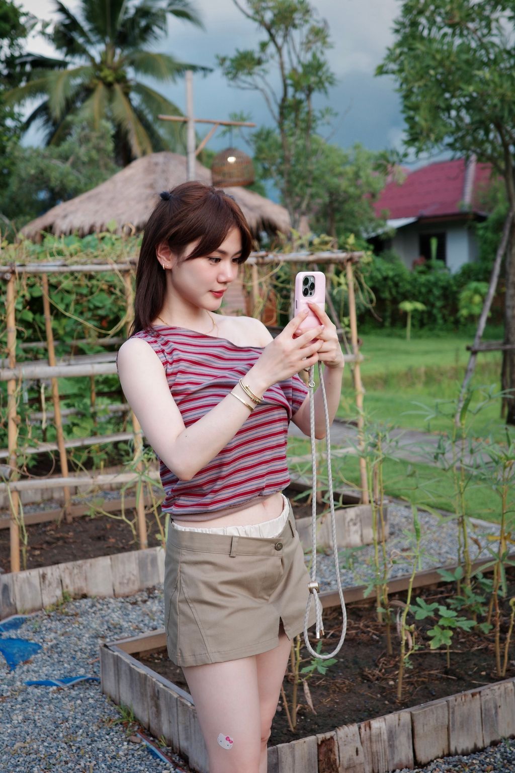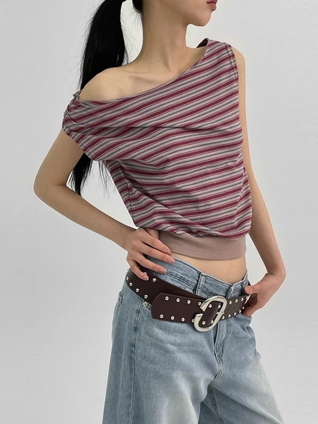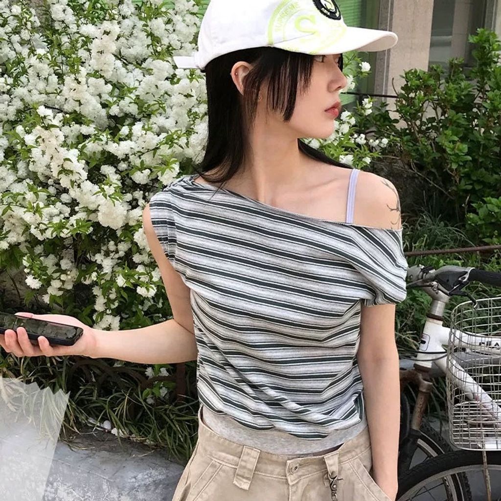 「韓國連線」N29 斜肩設計條紋top (兩色)